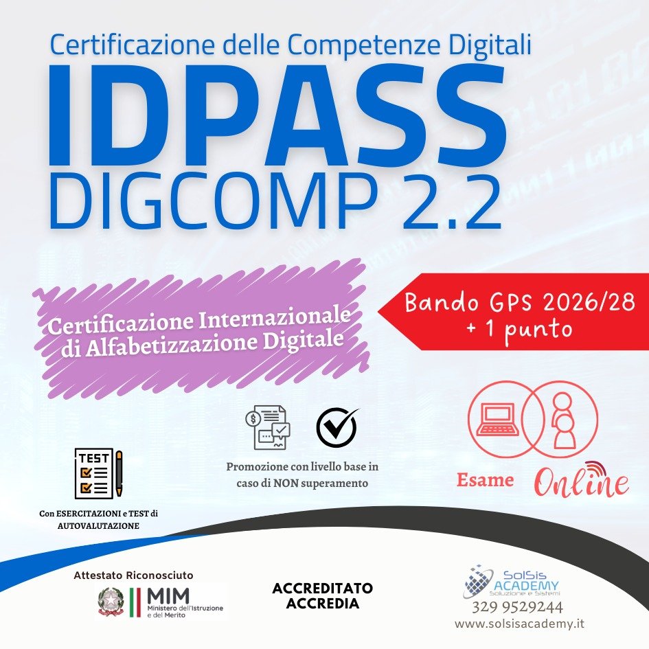 La certificazione IDPASS DigCompEdu è un riconoscimento ufficiale delle competenze digitali per educatori e formatori, basato sul framework europeo DigCompEdu. Progettata per supportare la trasformazione digitale nella didattica, valuta la capacità di integrare strumenti digitali nell’insegnamento, nella gestione delle risorse educative e nella promozione di ambienti di apprendimento innovativi; rappresenta il quadro di riferimento per insegnanti, educatori e formatori, inserito nel contesto del framework europeo delle competenze digitali dei cittadini DigComp 2.2.